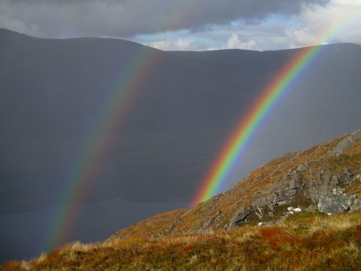 Then back along the ridge to Binnein Shuas. In good visibility, we could see a way up through the crags, but this would be difficult in the opposite direction. We were rewarded on the descent by a brilliant rainbow.